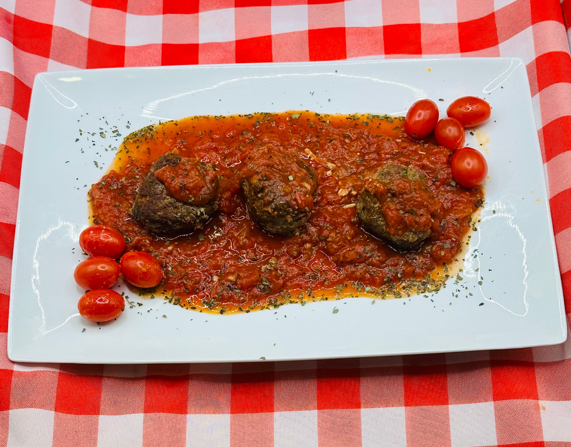 Prueba nuestras jugosas albóndigas de carne de res, perfectamente sazonadas y cocinadas a la perfección. Estas delicias están bañadas en una rica y aromática salsa tradicional italiana, preparada con ingredientes frescos y un toque de albahaca que aporta un sabor único y auténtico. Para completar esta experiencia culinaria, añadimos una generosa espolvoreada de queso parmesano rallado, que realza cada bocado con su textura y sabor inconfundibles. Un plato que combina la tradición italiana con un toque de elegancia y calidez hogareña.